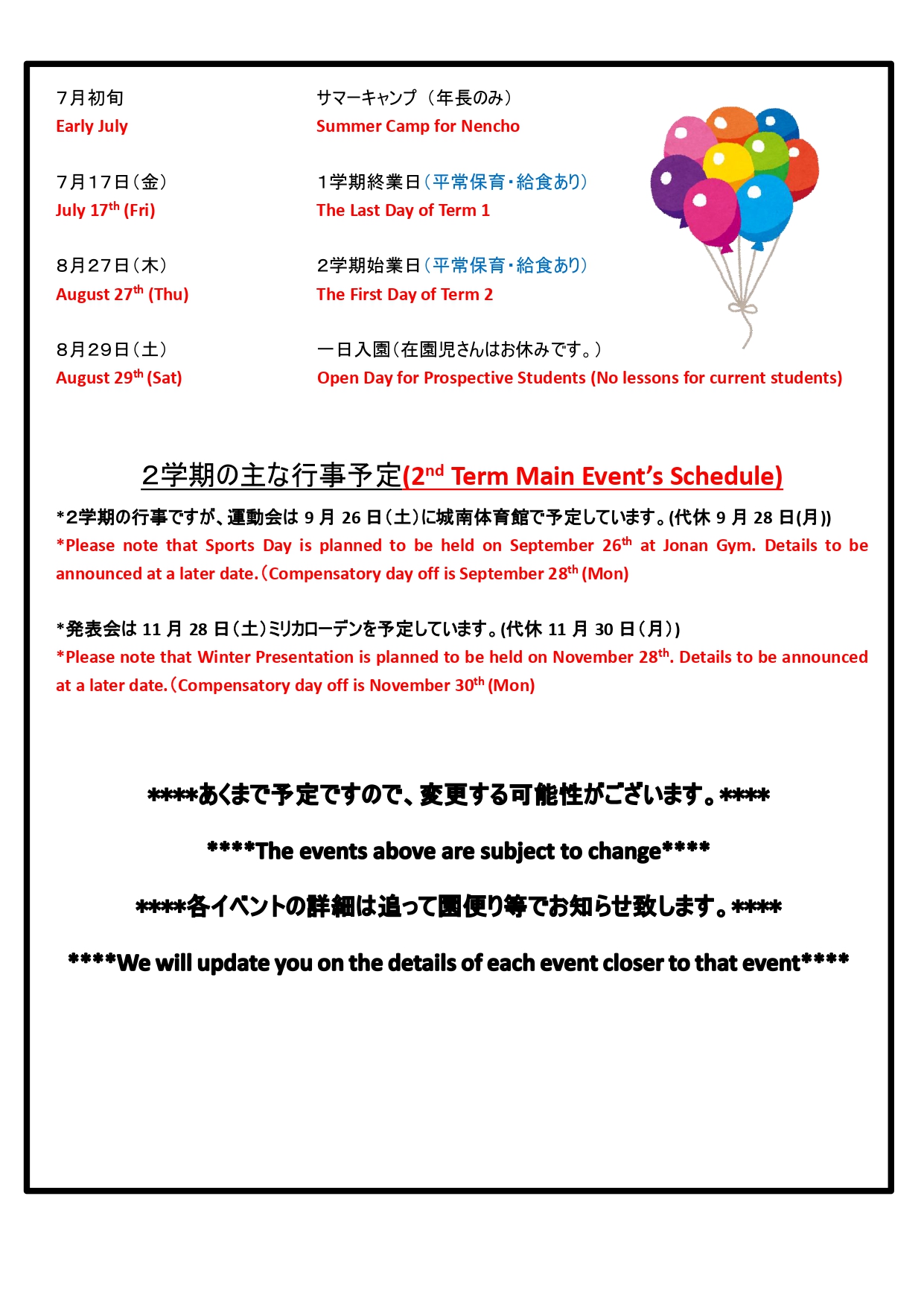 月曜日(Monday) Greeting・Morning Routine・Health Check・English Lesson・DVD Lesson・Play Room・給食